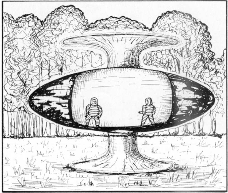 The cylinder has two blue ends and a transparent center through which he can see two humanoids less than 3 feet tall in metallic helmets and dressed in puffy suits like the Michelin Man (the tire company mascot).